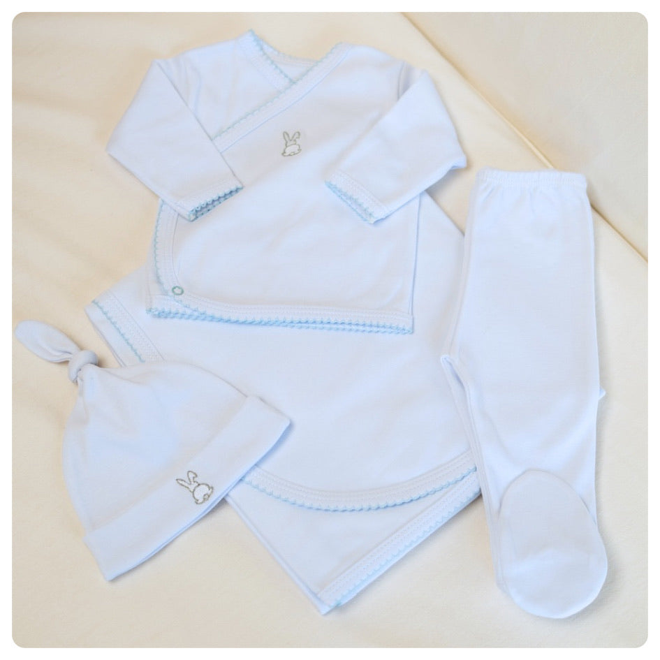- Conjunto de batita, pelele y gorrito de algodón orgánico blanco con picot beige, celeste o rosado