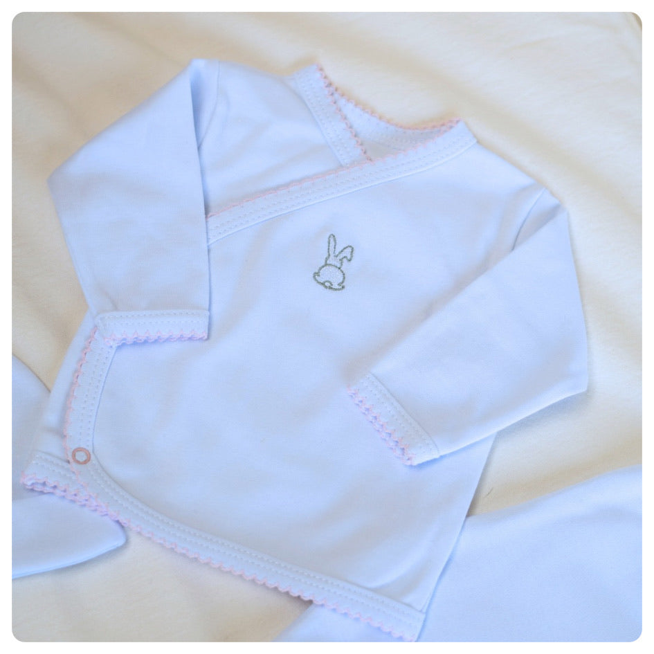 - Conjunto de batita, pelele y gorrito de algodón orgánico blanco con picot beige, celeste o rosado