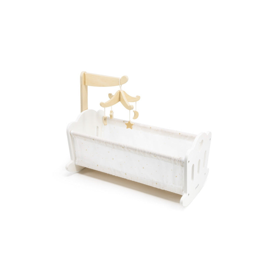 Incluye una almohada y una colcha de algodón suave con un dulce estampado de estrellas y lunas y un elegante móvil de cuna como decoración.